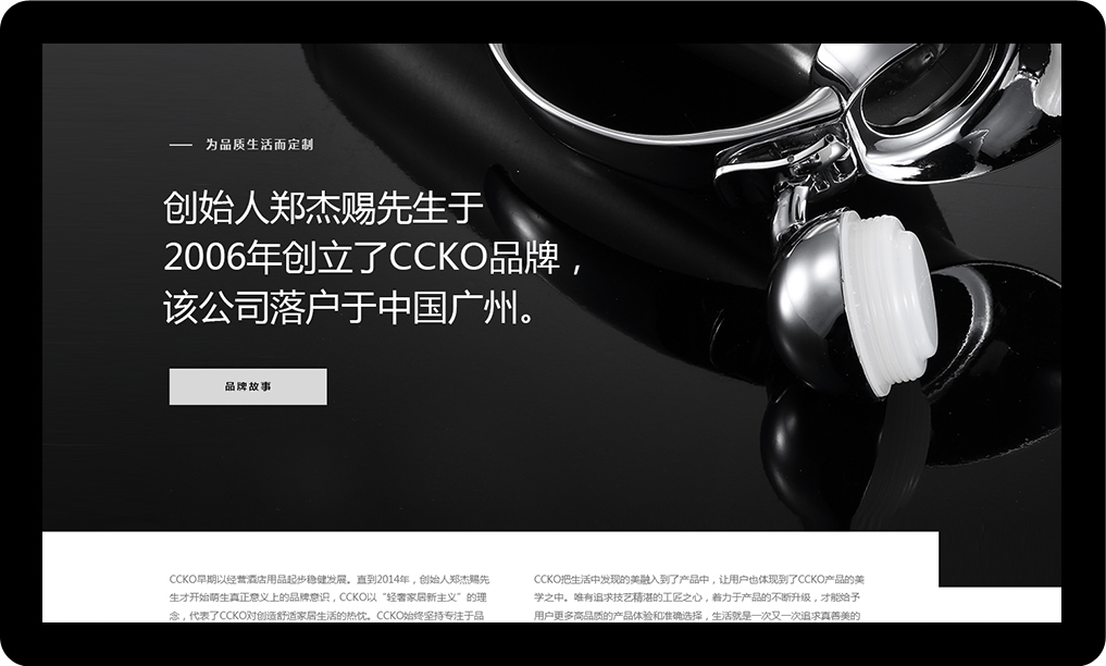 CCKO早期以經營酒店用品起步穩健發展。直到2014年,創始人鄭杰賜先生才開始萌生真正意義上的品牌意識, CCKO以“輕奢家居新主義”的理念,代表了CCKO對創造舒適家居生活的熱忱。 CCKO始終堅持專注于品質,不斷引領輕奢家居新主義,由此開創了CCKO的家居用品新時代。